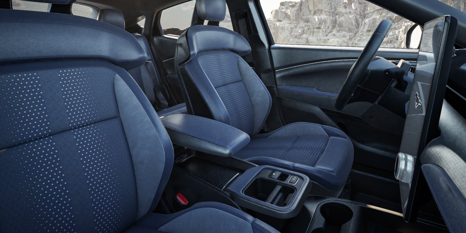 Στο εσωτερικό, κυριαρχεί η απόχρωση Navy Pier, με σπορ καθίσματα επενδυμένα σε υλικά ActiveX και Miko. Οι μπλε και ασημί λεπτομέρειες συμπληρώνουν την εικόνα, ενώ η χρήση συνθετικών υλικών εντάσσεται στη συνολική στρατηγική βιωσιμότητας.