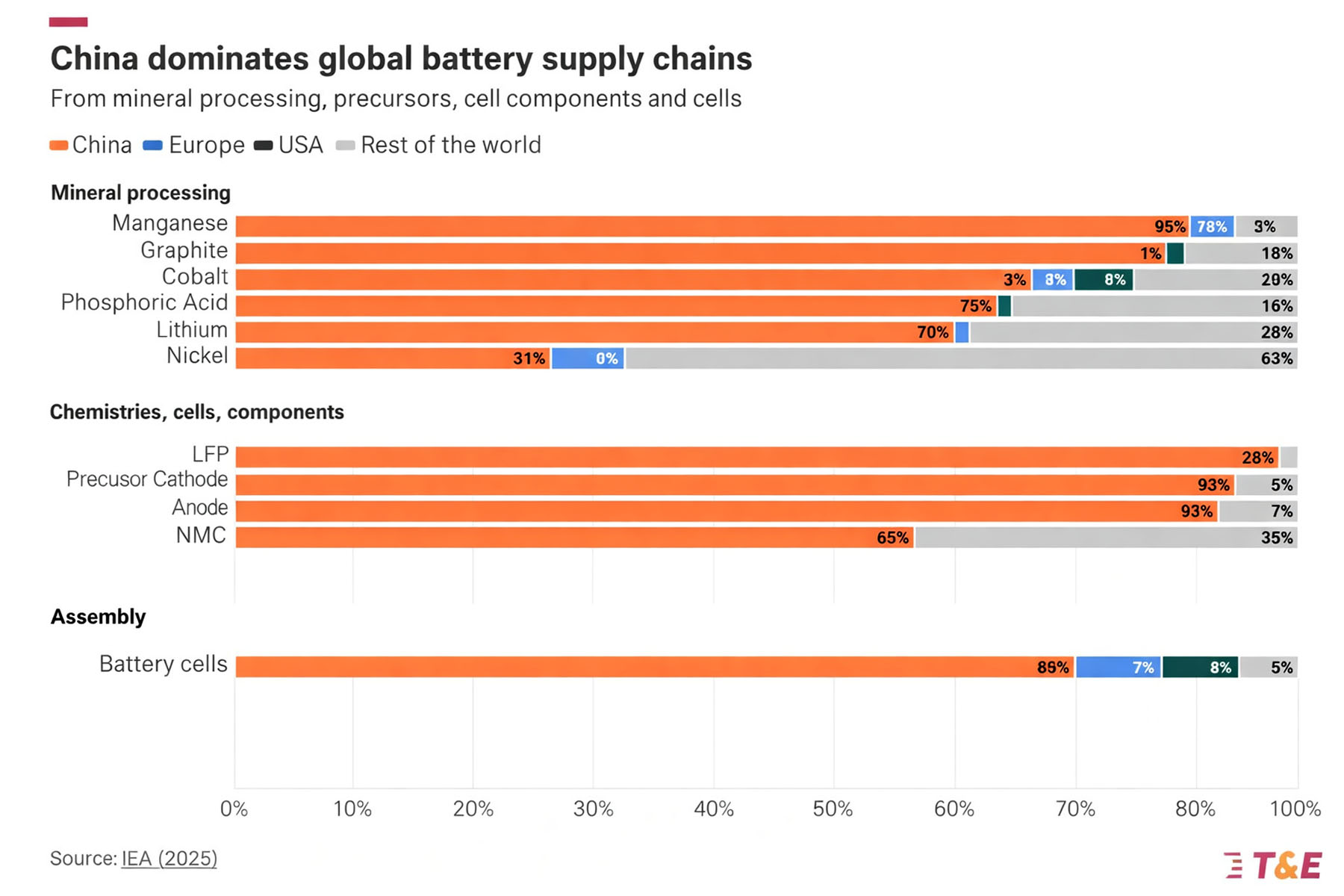 Η αλυσίδα ξεκινά από τις πρώτες ύλες. Η Κίνα έχει κυρίαρχο ρόλο στην επεξεργασία βασικών μετάλλων και υλικών, ελέγχοντας περίπου το 95% του μαγγανίου και του γραφίτη, το 78% του κοβαλτίου, το 73% του φωσφορικού οξέος και το 70% του λιθίου. Πρόκειται για υλικά που αποτελούν τη βάση των σύγχρονων στοιχείων μπαταριών, γεγονός που της δίνει στρατηγικό πλεονέκτημα.