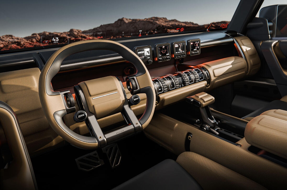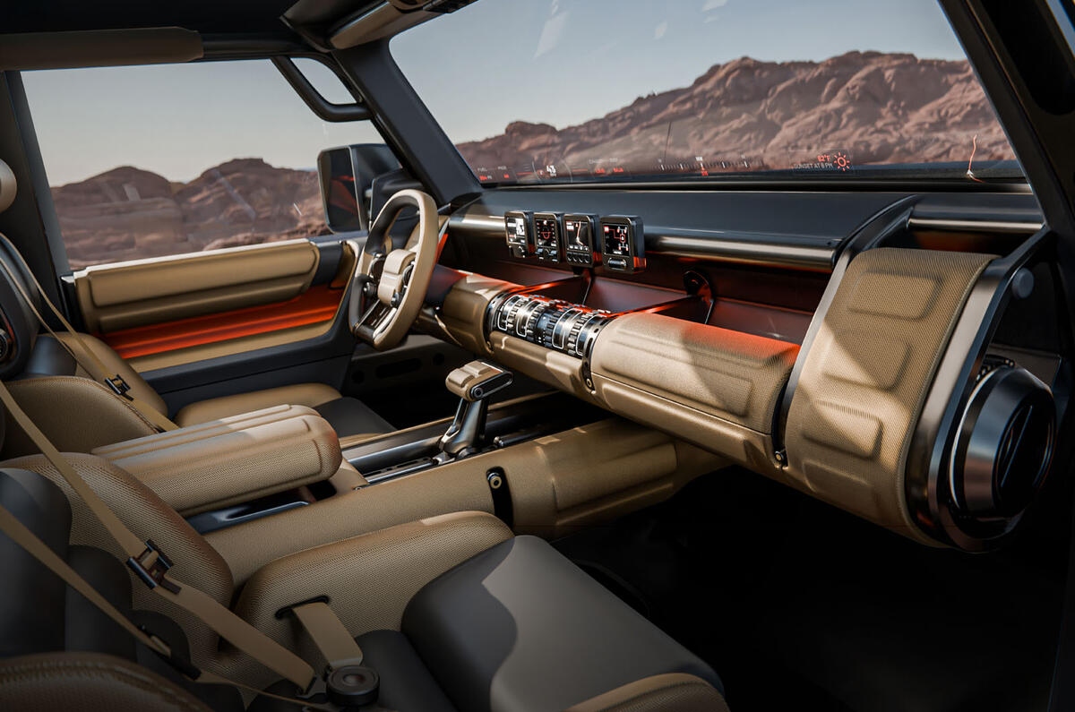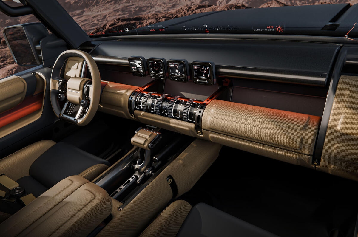 Στο εσωτερικό, η προσέγγιση είναι καθαρά λειτουργική, με μεγάλους διακόπτες και περιστροφικά χειριστήρια για εύκολη χρήση σε εκτός δρόμου συνθήκες.