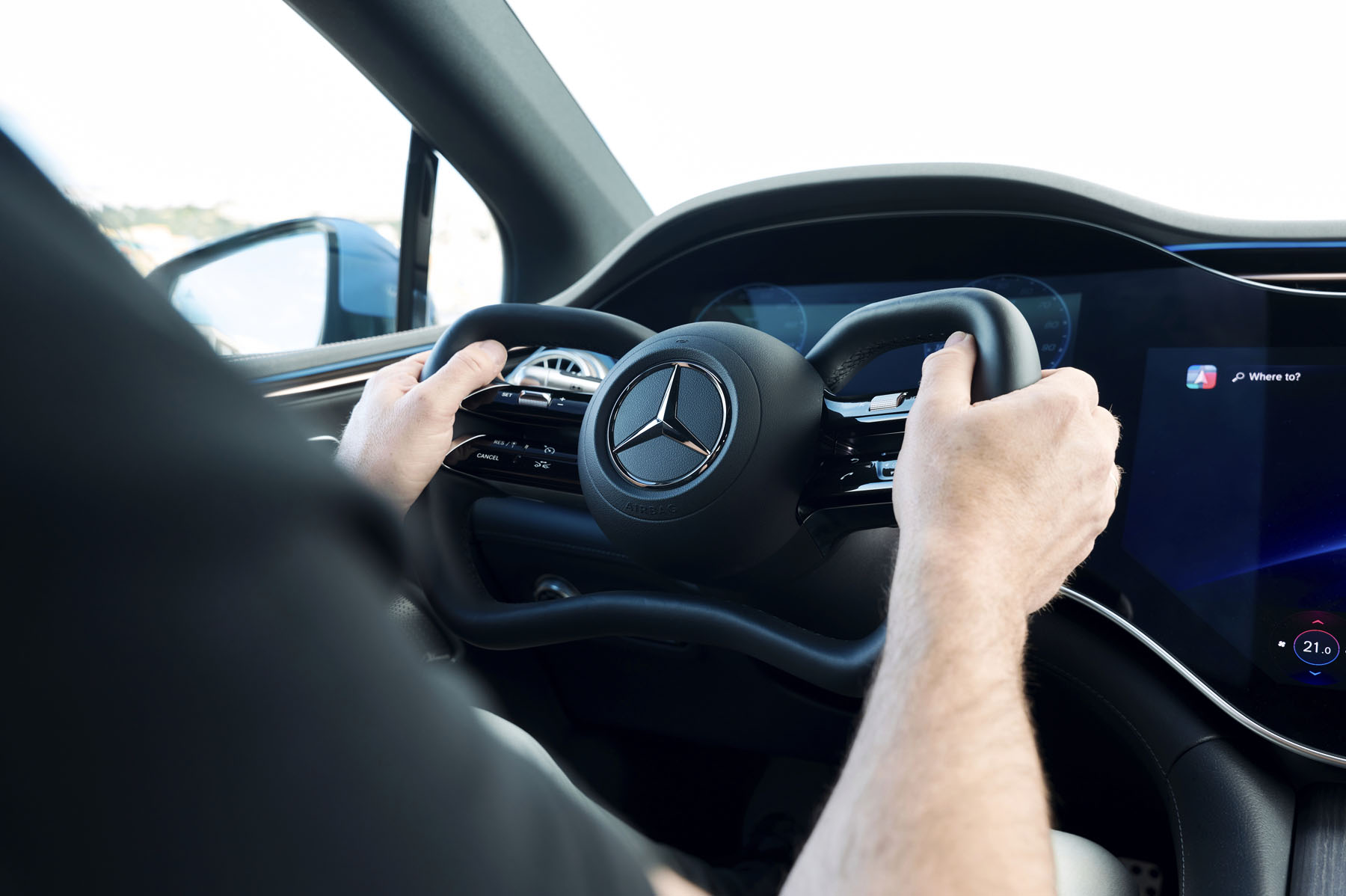 Η απουσία της κλασικής μηχανικής σύνδεσης επιτρέπει και σημαντικές αλλαγές στο εσωτερικό. Το τιμόνι γίνεται πιο επίπεδο και συμπαγές, βελτιώνοντας την ορατότητα προς τον πίνακα οργάνων και διευκολύνοντας την είσοδο και έξοδο από το αυτοκίνητο. Το αποτέλεσμα είναι μια πιο «ανοιχτή» αίσθηση στην καμπίνα, στοιχείο που ενισχύει τον premium χαρακτήρα της EQS.