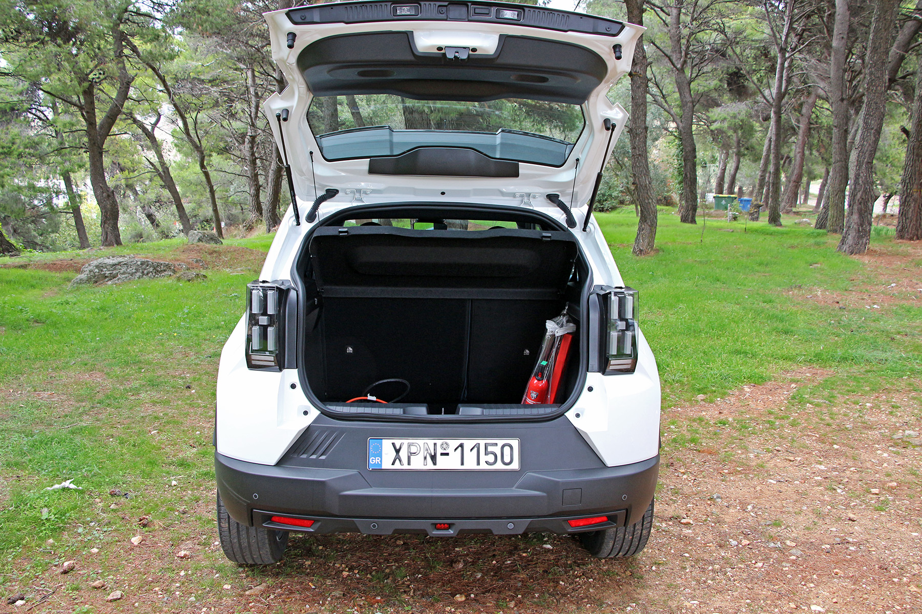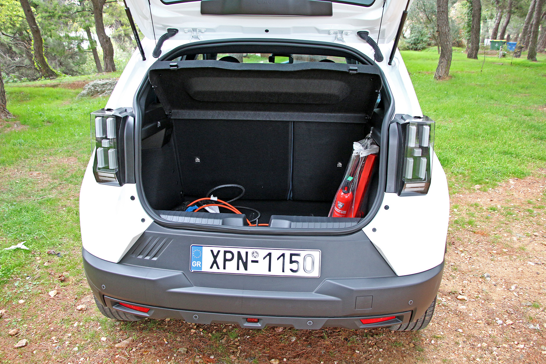 Εκεί θα συναντήσει κάποιος το καλώδιο για φόρτιση σε πρίζα σούκο (δεν υπάρχει κρυφό δάπεδο), με το αντίστοιχο καλώδιο για φόρτιση σε wallbox να είναι ενσωματωμένο στο εμπρός μέρος σε σπιράλ και κρυμμένο πίσω από τα όμορφα πίξελ της μάσκας.