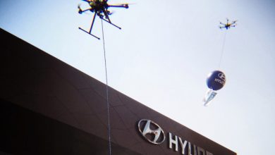 Hyundai car show room with flying drones carrying advertisements. Mexico City, Mexico.…